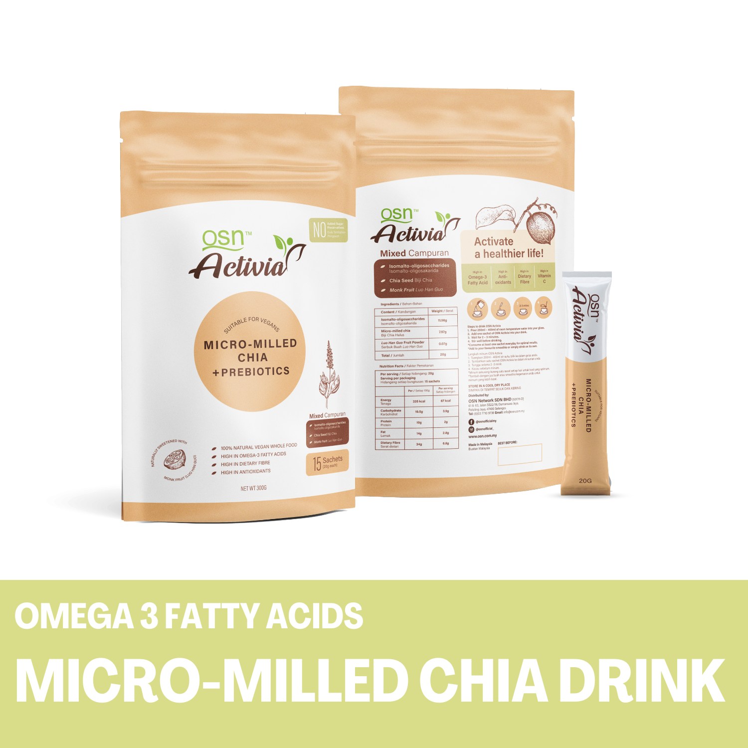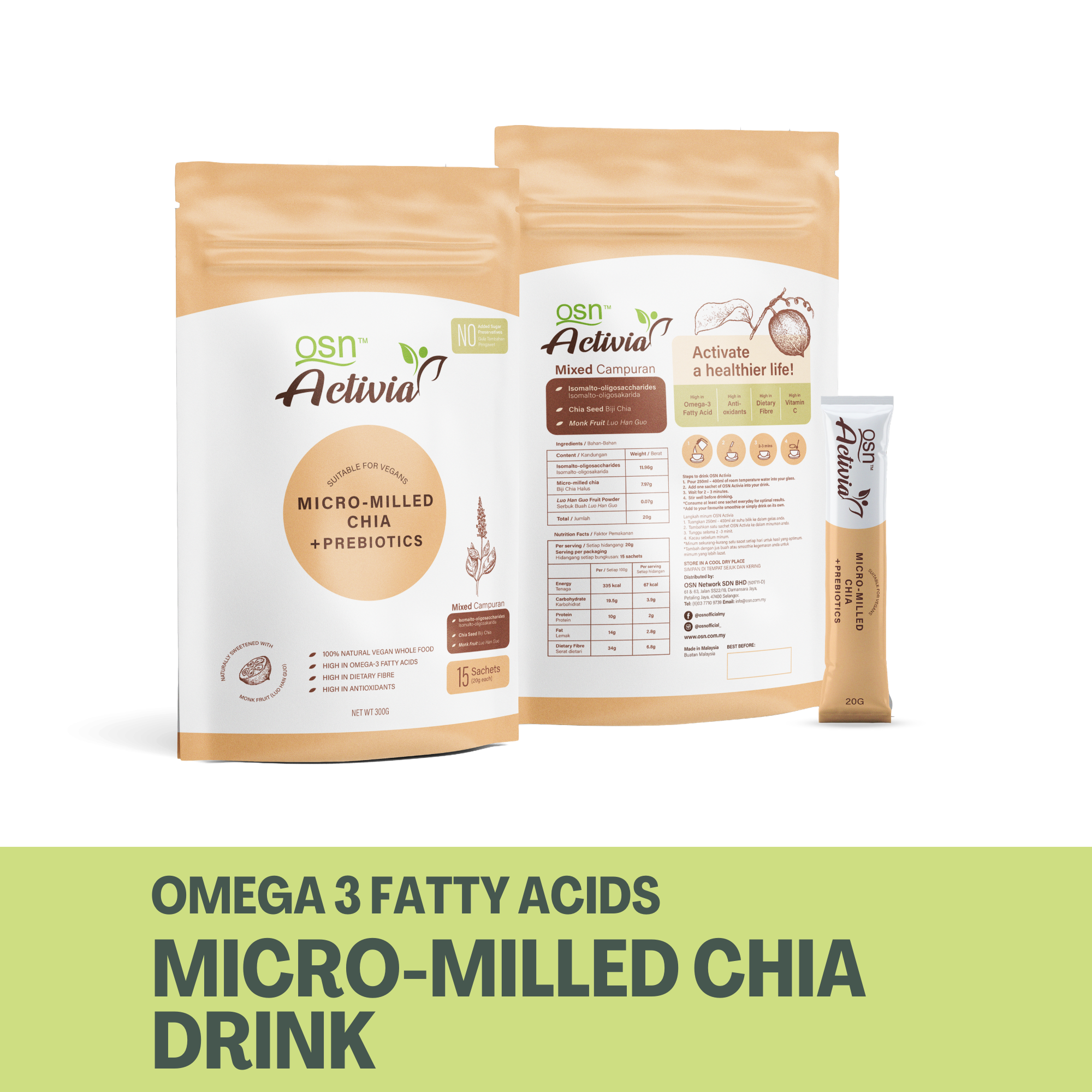 If you’re having a busy day, this healthy drink will help you get rid of hunger pangs in an instant. All you need to do is pour one sachet of OSN Activia into a glass of room temperature water. Wait for 2-3 minutes, stir then drink! Not only is it incredibly quick to prepare, it’s also naturally sweetened with Monk Fruit (Luo Han Guo) which you can only find in some parts of Asia.