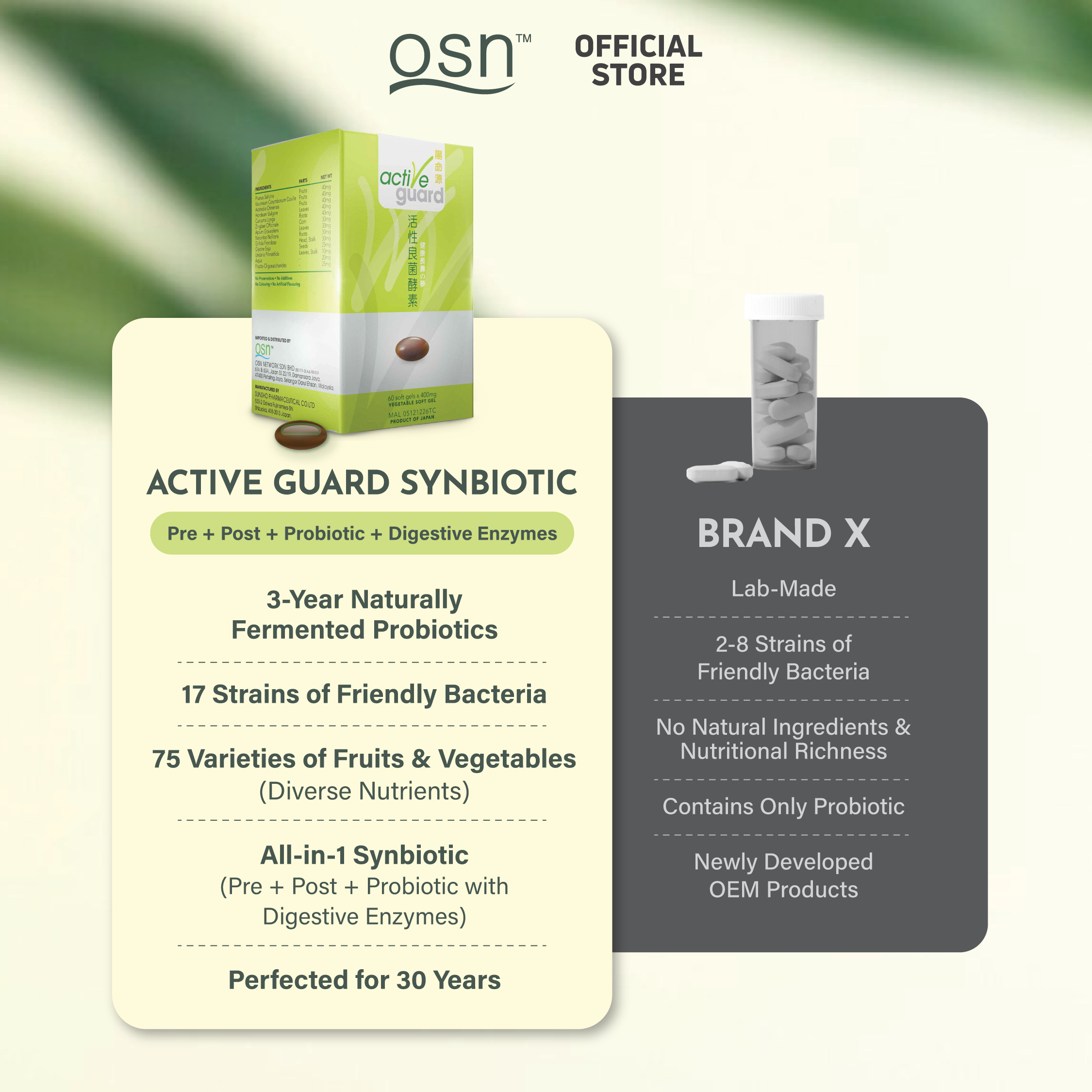 Our signature All-in-1 Synbiotic (Probiotics, Prebiotics, Postbiotics, Digestive Enzymes) with a superior method of preparation. OSN Active Guard is uniquely fermented with 75 fruits and vegetables and 17 strains of cultured friendly bacteria for 3 years at Kibi-heights which is 300m above sea level, in Okayama, Japan. The ingredients are harvested during the best season at peak nutritional value. This extended fermentation, spanning all four seasons, enhances the viability of friendly bacteria, resulting in a fermented extract rich in minerals, vitamins, enzymes, and other pre-digested food ingredients, ensuring easy absorption by the body.
