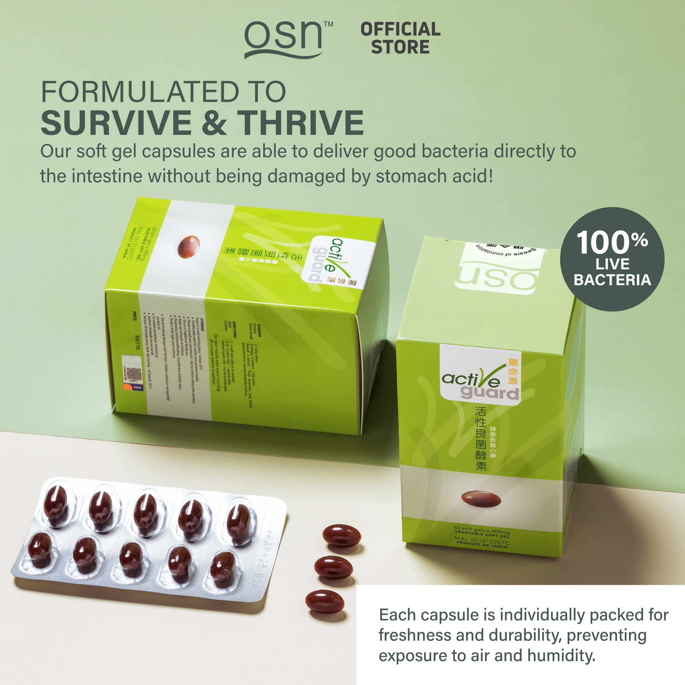 80% of our immunity is in the gut. Good health begins with the gastrointestinal tract, especially the colon. Within the colon resides about 400 species of bacteria weighing about 1.5kg. For optimal health, friendly bacteria must be present. However, there are many conditions that deplete good bacteria over time, such as antibiotic use, stressful lifestyles, poor eating habits, old age, and other factors. Low population of good bacteria can lead to negative health such as digestive problems, leaky gut syndrome, Candida infection, depression, skin problem, and other issues. Taking synbiotics (probiotics + prebiotics + postbioitcs) like OSN Active Guard on a regular basis helps replenish good bacteria and boost immune levels, preventing pathogens from developing into major diseases.