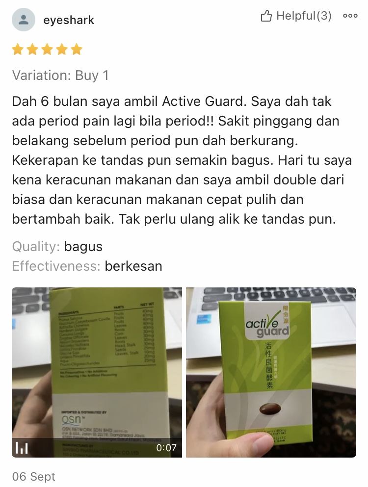 e*****Dah 6 bulan saya ambil Active Guard. Saya dah tak ada period pain lagi bile period!! Sakit pinggang dan belakang sebelum period pun dah berkurang. Kekerapan ke tandas pun semakin bagus.Hari tu saya kena keracunan makanan dan saya ambil double dri biasa dan keracunan makanan cepat pulih dan bertambah baik. Tak perlu ulang alik ke tandas pun.