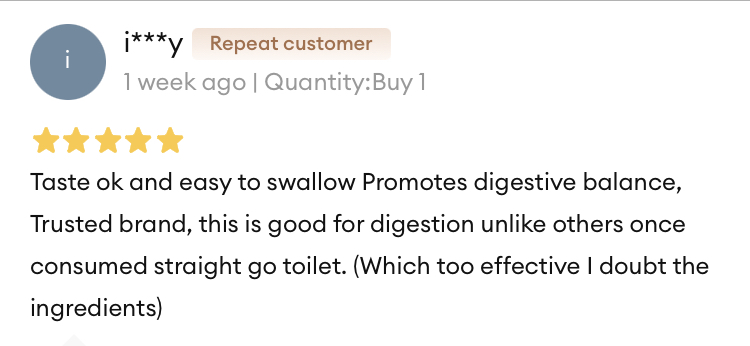 i***yTaste ok and easy to swallow. Promotes digestive balance, trusted brand, this is good for digestion unlike others once consumed straight go toilet. ( Which too effective I doubt the ingredients)