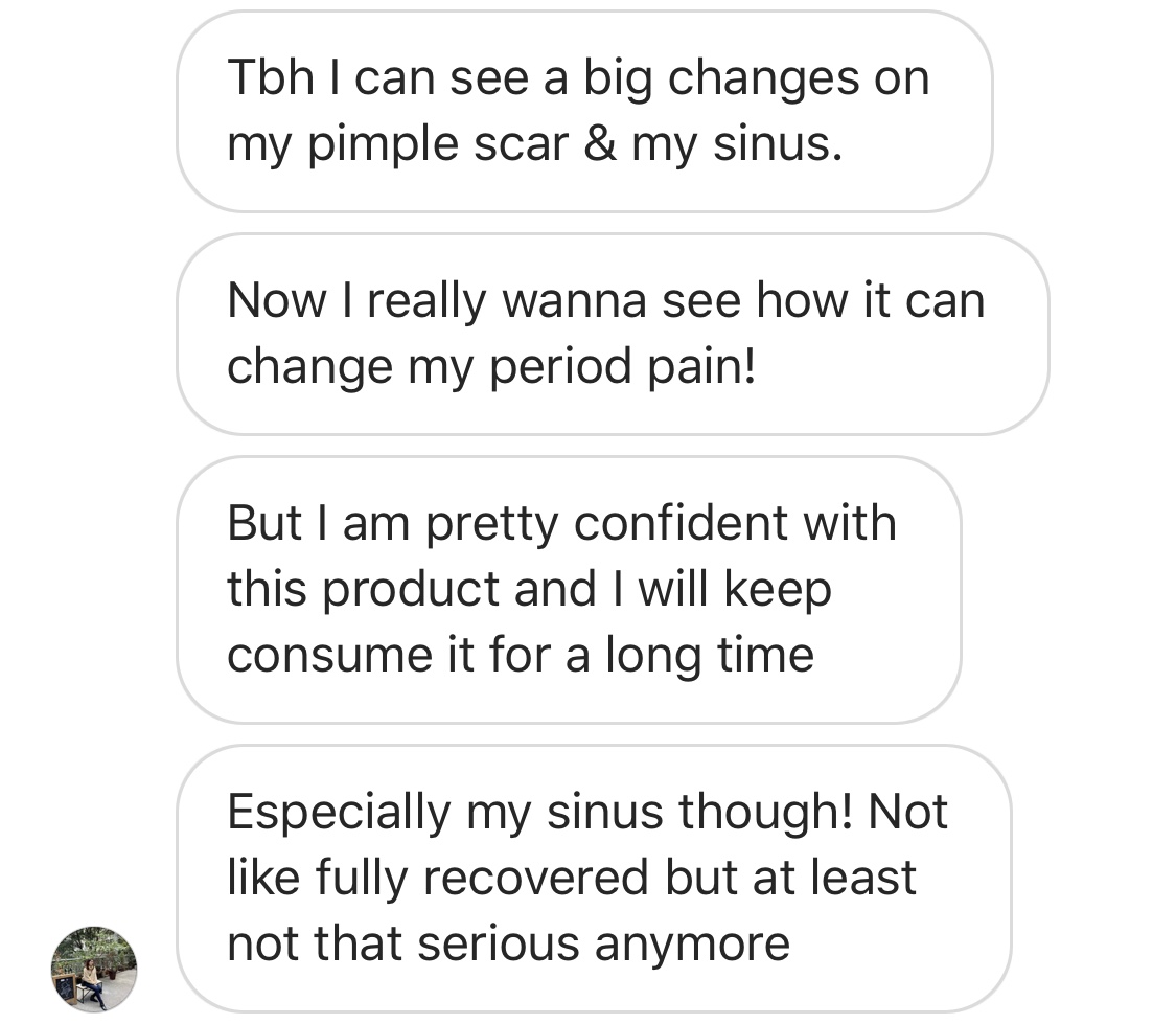 ChilenTBH I can see big changes on my pimple scar & my sinus. Now I really wanna see how it can change my period pain! But I am pretty confident with this product and I will keep consume it for a long time. Especially my sinus though! Not like fully recovered not that serious anymore.