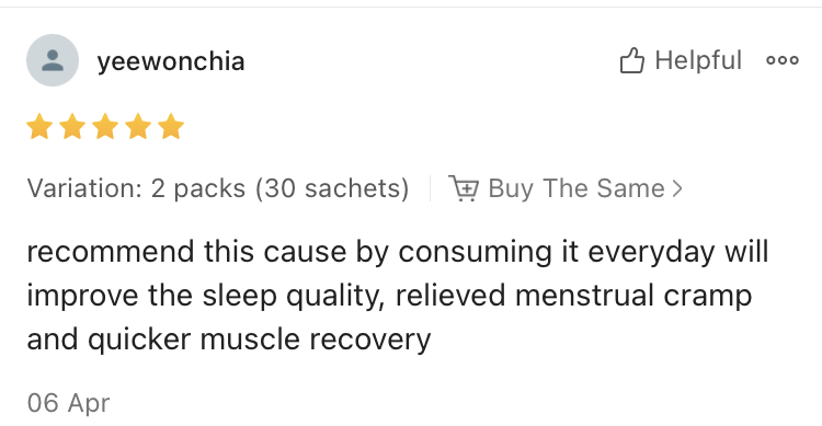 Yee Won ChiaRecommend this cause by consuming it everyday will improve the sleep quality, relieved menstrual cramp and quicker muscle recovery