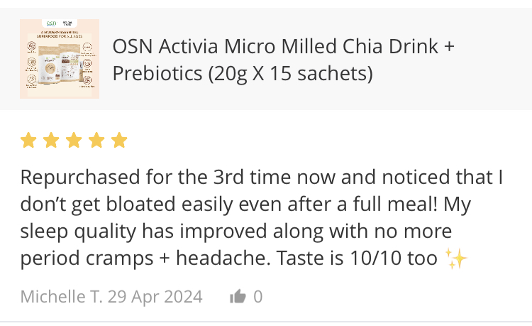 MichelleRepurchased for the 3rd time now and noticed that I don't get bloated easily even after a full meal! My sleep quality has improved along with no more period cramps + headache. Taste is 10/10 too!!