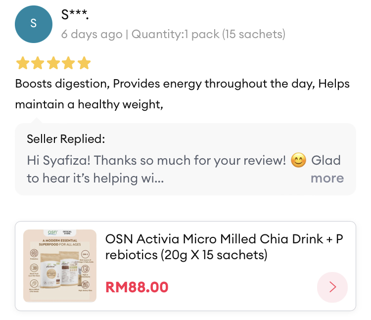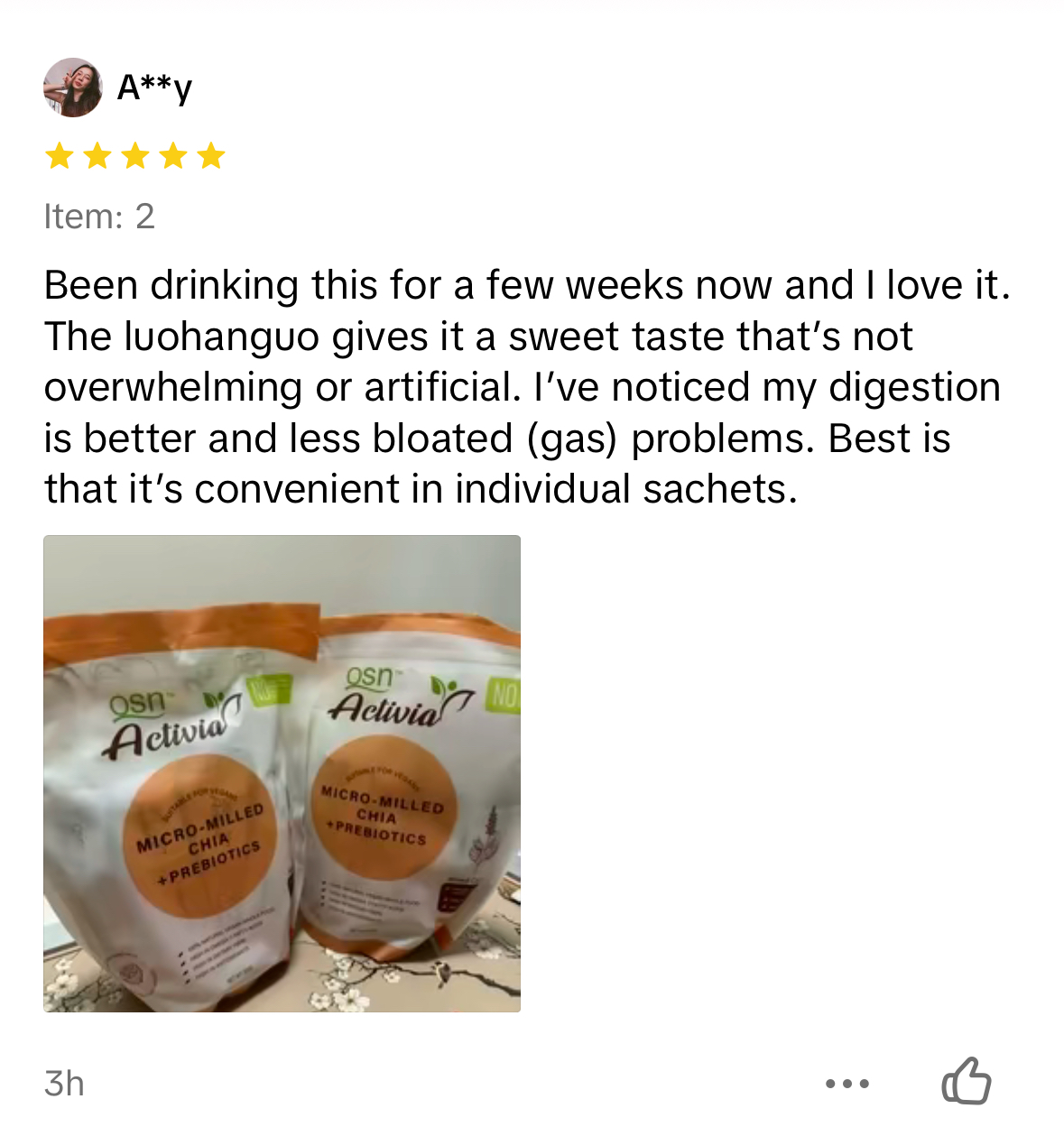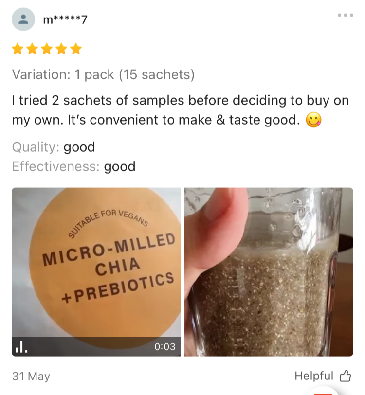Kersheen C.This is my favourite chia drink! I've been taking this daily! Really recommend this! It's easy to prepare, healthy and rich in prebiotics.