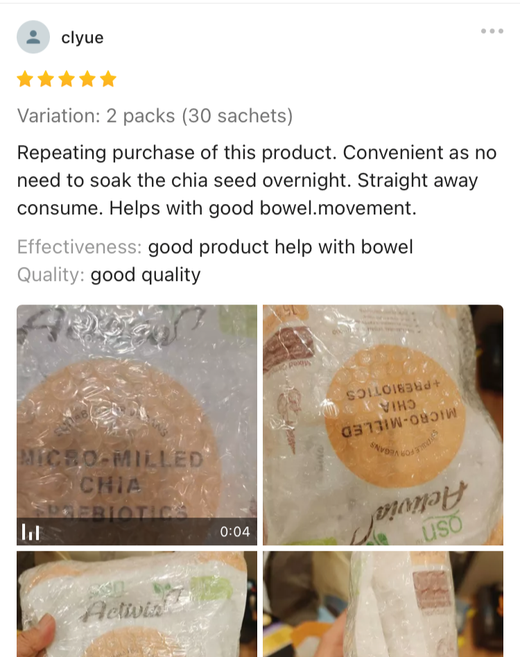 clyueRepeatign purchase of this product. Convenient as no need to soak the chia seed overnight. Straight away consume. Helps with good bowel movement.