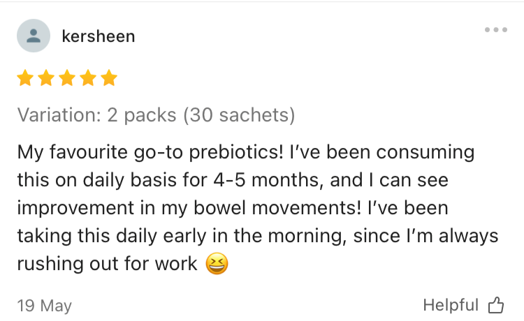 KERSHEENMy favourite go-to prebiotics! I've been consuming this on daily basis for 4-5 months, I can see improvement in my bowel movements! I've been taking this daily early in the morning, since I'm always rushing out for work.