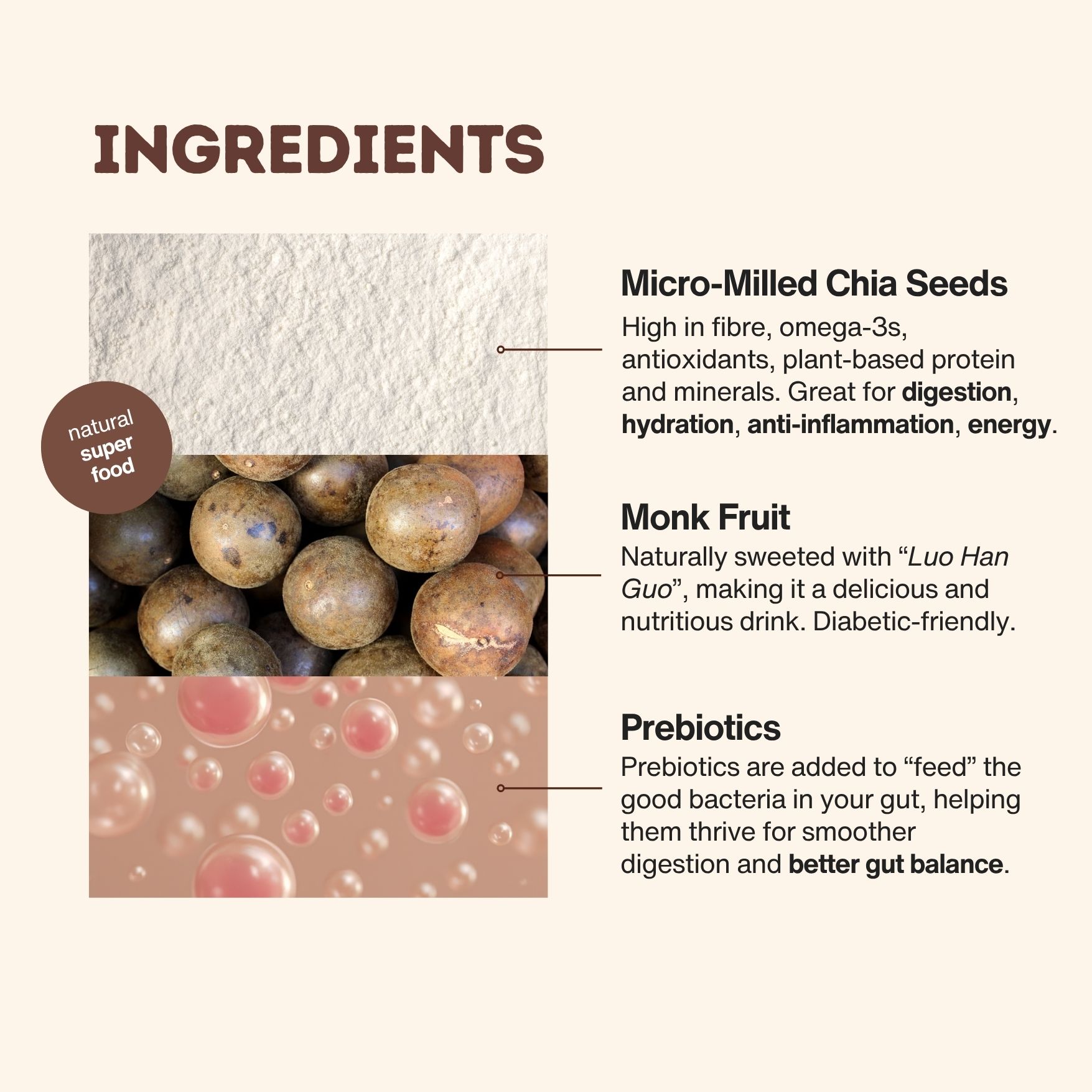3. Smooth & Tasty - Finely milled chia with Monk Fruit (Luo Han Guo) offers a naturally sweet, smooth, no refined sugar, and easy-to-drink texture.