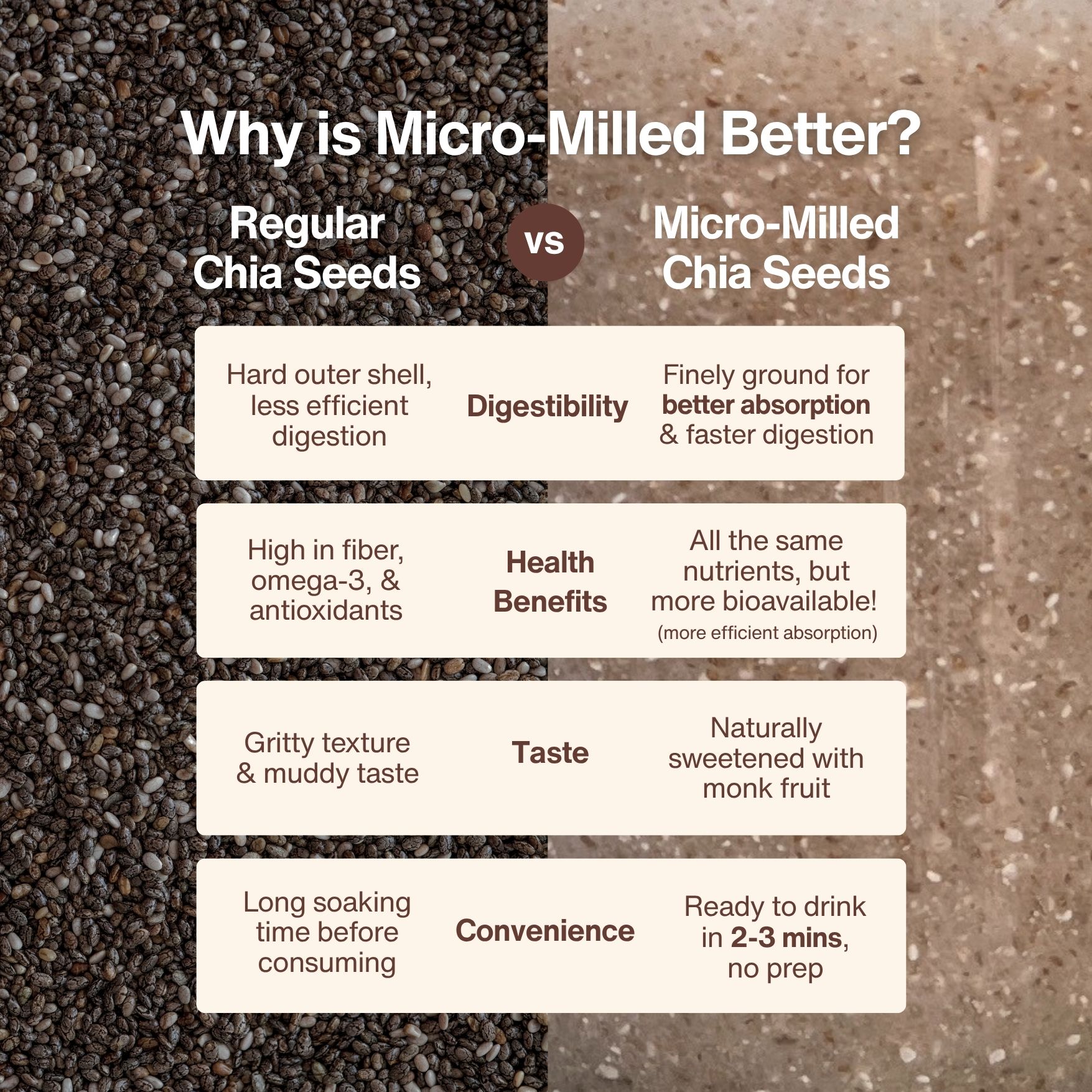 1. Better Nutrient Absorption - Cold micro-milling makes chia seeds easier to digest & absorb