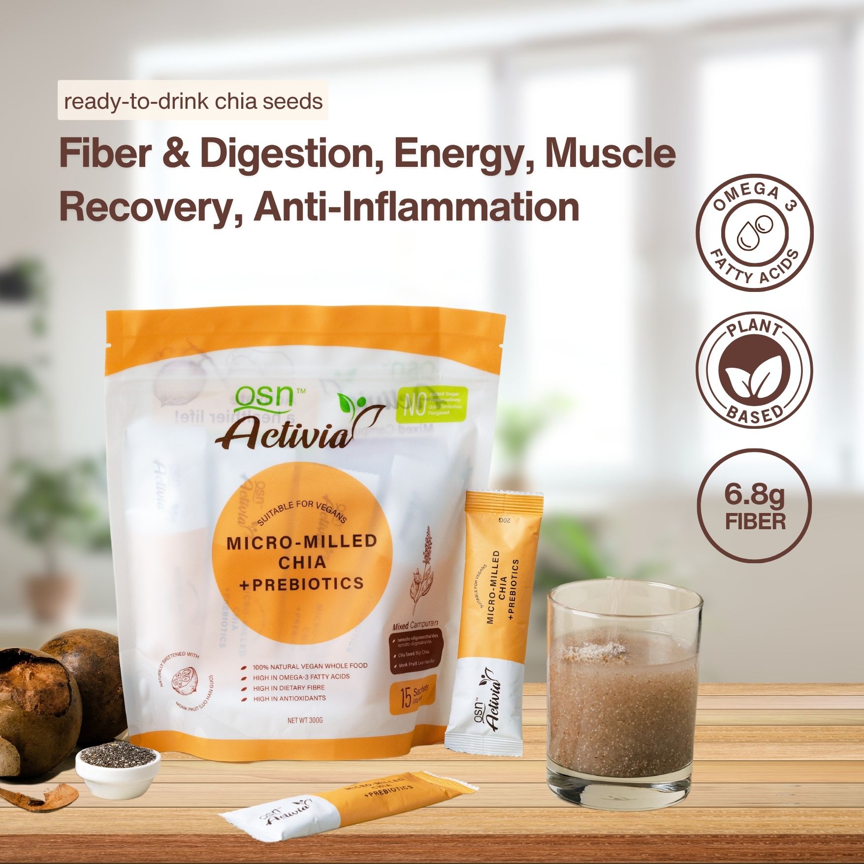 A modern essential superfood that benefits all ages. OSN Activia is our prebiotic micro-milled chia seed drink, naturally sweetened with Monk Fruit (Luo Han Guo). Only takes 3 minutes to prepare, but boosts your energy and mood for the rest of the day.